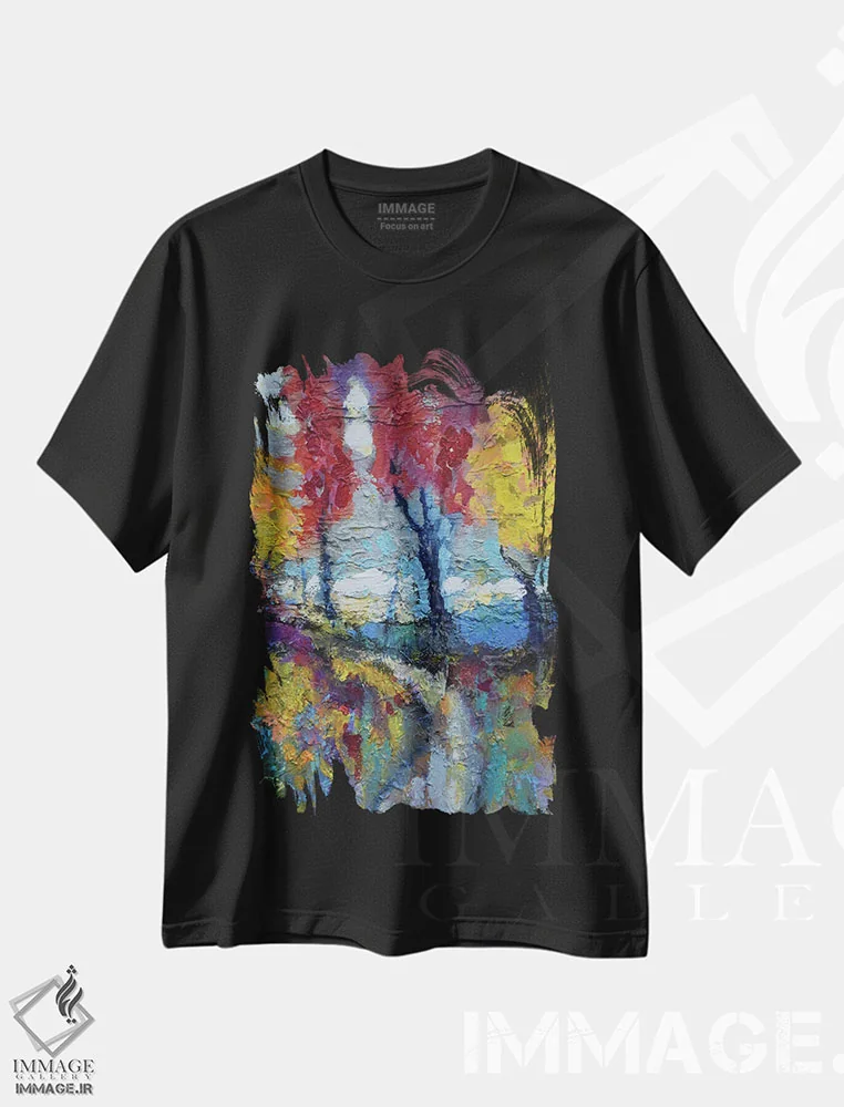 تیشرت مشکی طرح دار پاییز در ذهن من، هنر فاخر معاصر اثر کیم اشلمن | فروشگاه ایماژ تیشرت طرح دار پاییز در ذهن من اثر کیم اشلمن