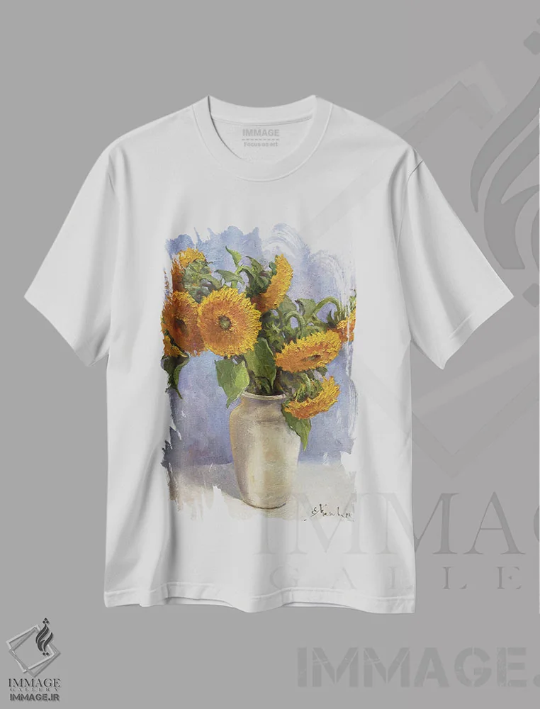 تیشرت سفید طرح دار گل های آفتابگردان، مدیوم اثر اوگنیا مکانوا | فروشگاه ایماژ تیشرت طرح دار گل های آفتابگردان اثر اوگنیا مکانوا