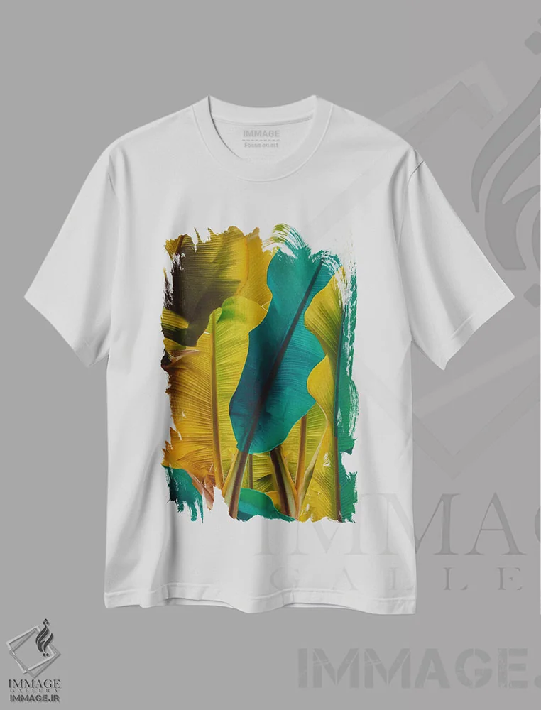 تیشرت سفید طرح دار برگ های موز به رنگ فیروزه ای و زرد، تزئینی اثر ایوجنیا بیدیوک | فروشگاه ایماژ تیشرت طرح دار برگ های موز به رنگ فیروزه ای و زرد اثر ایوجنیا بیدیوک