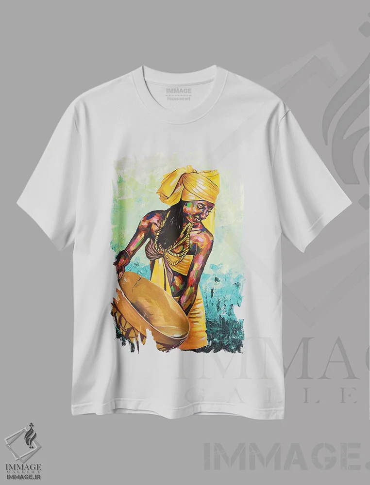 تیشرت سفید طرح دار طبل سخنگو، هنر آمریکایی آفریقایی تبار اثر هری ادونزه | فروشگاه ایماژ تیشرت طرح دار طبل سخنگو اثر هری ادونزه