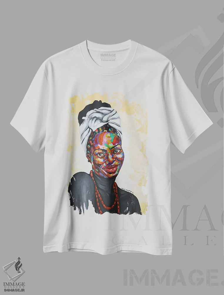 تیشرت سفید طرح دار دختر خدمتکار نیجریه ای، هنر آمریکایی آفریقایی تبار اثر لیز کاوینگتون | فروشگاه ایماژ تیشرت طرح دار دختر خدمتکار نیجریه ای اثر لیز کاوینگتون