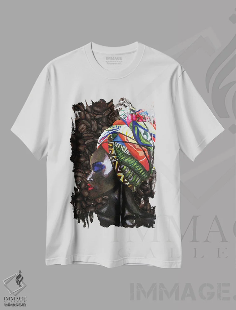 تیشرت سفید طرح دار ملکه قهوه، هنر آمریکایی آفریقایی تبار اثر کاترینا بورتسووا | فروشگاه ایماژ تیشرت طرح دار ملکه قهوه اثر کاترینا بورتسووا