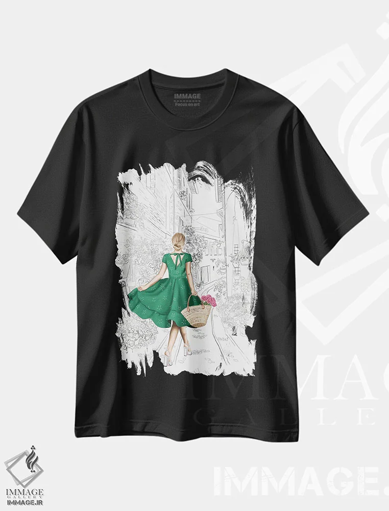 تیشرت مشکی طرح دار "کوچه گل ها"، دست نقاشی و طراحی دستی اثر الزا فوچه | فروشگاه ایماژ تیشرت طرح دار "کوچه گل ها" اثر الزا فوچه