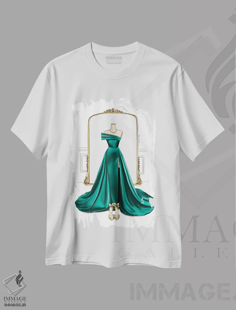 تیشرت سفید طرح دار پیراهن بلند و آینه، تزئینی اثر الزا فوچه | فروشگاه ایماژ تیشرت طرح دار پیراهن بلند و آینه اثر الزا فوچه