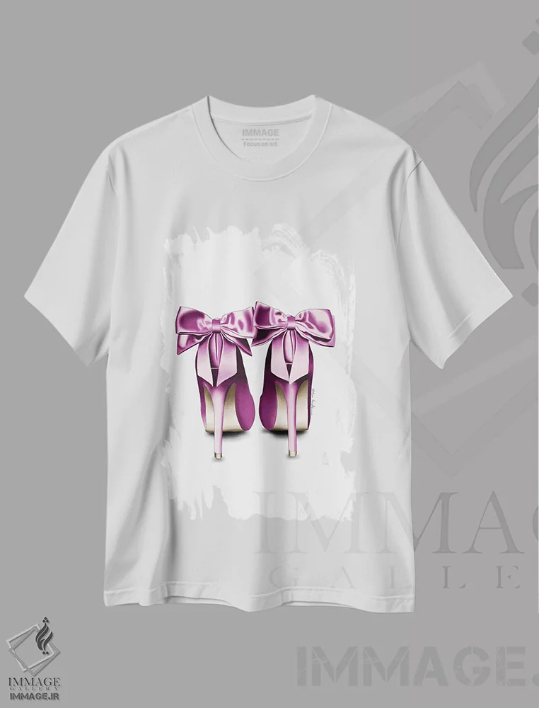 تیشرت سفید طرح دار کفش پاشنه دار با پاپیون ساتن، دست نقاشی و طراحی دستی اثر الزا فوچه | فروشگاه ایماژ تیشرت طرح دار کفش پاشنه دار با پاپیون ساتن اثر الزا فوچه