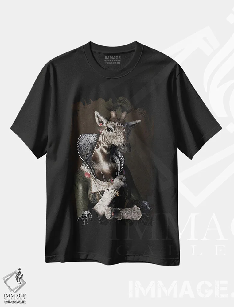 تیشرت مشکی طرح دار پرتره زرافه به سبک رنسانس قدیمی، هنر دیجیتال اثر جوفری فیلیپ | فروشگاه ایماژ تیشرت طرح دار پرتره زرافه به سبک رنسانس قدیمی اثر جوفری فیلیپ