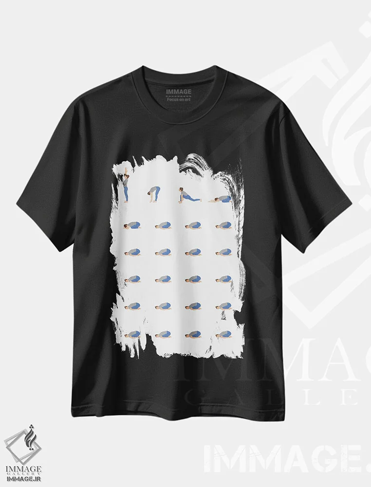 تیشرت مشکی طرح دار روتین یوگا، تزئینی اثر گیسل دکل | فروشگاه ایماژ تیشرت طرح دار روتین یوگا اثر گیسل دکل