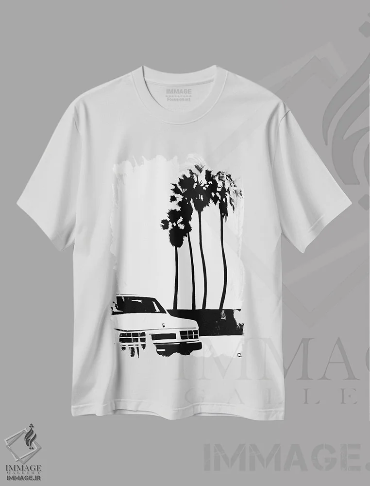 تیشرت سفید طرح دار ماشین و نخل ها، هنر تزئینی سیاه و سفید اثر جوزپه کریستیانو | فروشگاه ایماژ تیشرت طرح دار ماشین و نخل ها اثر جوزپه کریستیانو