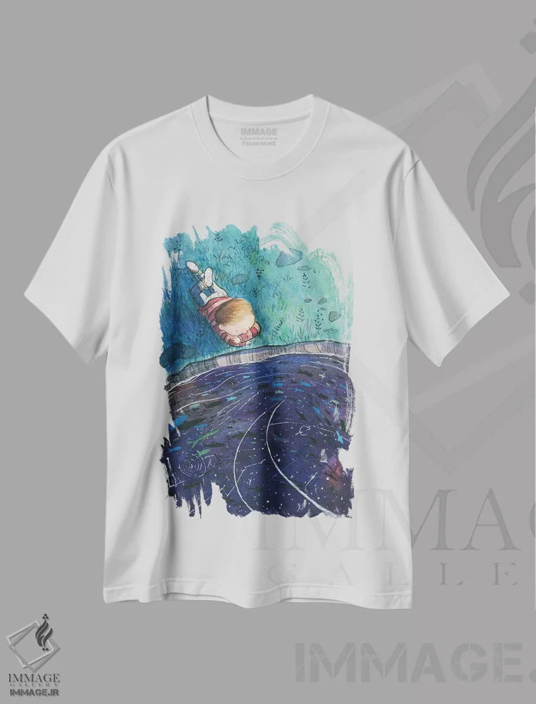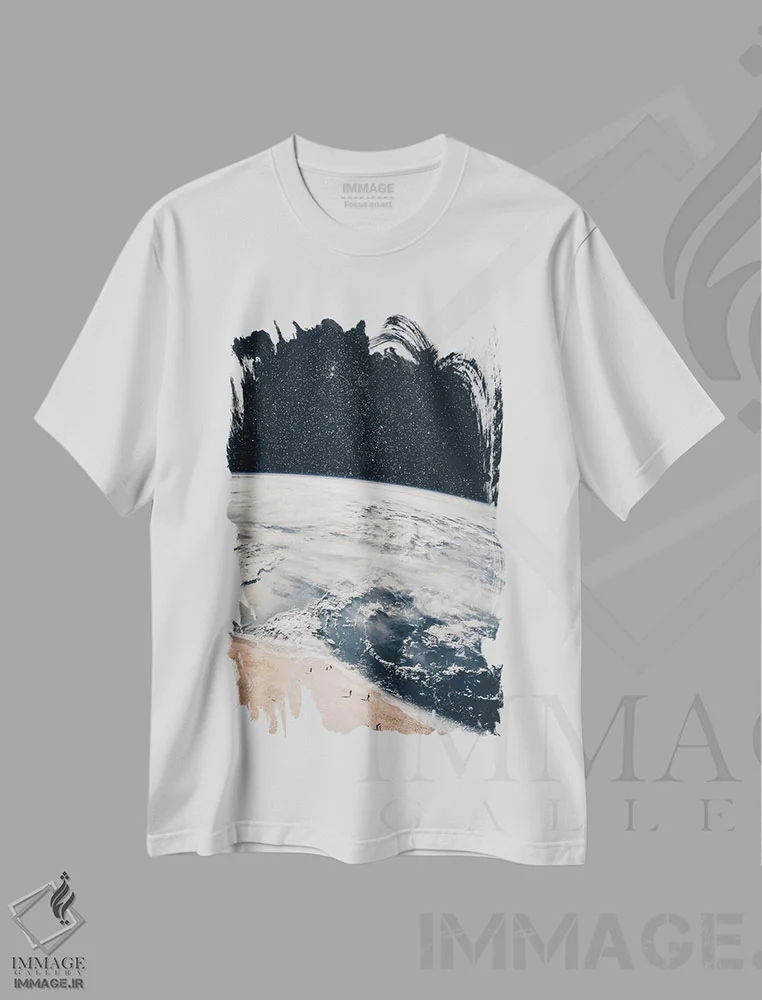 تیشرت سفید طرح دار پیاده روی در ساحل میان ستارگان فضا، هنر دیجیتال اثر جن زد | فروشگاه ایماژ تیشرت طرح دار پیاده روی در ساحل میان ستارگان فضا اثر جن زد