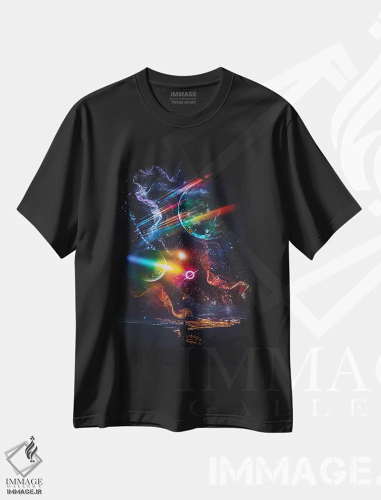 تیشرت مشکی طرح دار حلقه های مسیر و فضا، عکاسی ترکیبی اثر جن زد | فروشگاه ایماژ تیشرت طرح دار حلقه های مسیر و فضا اثر جن زد