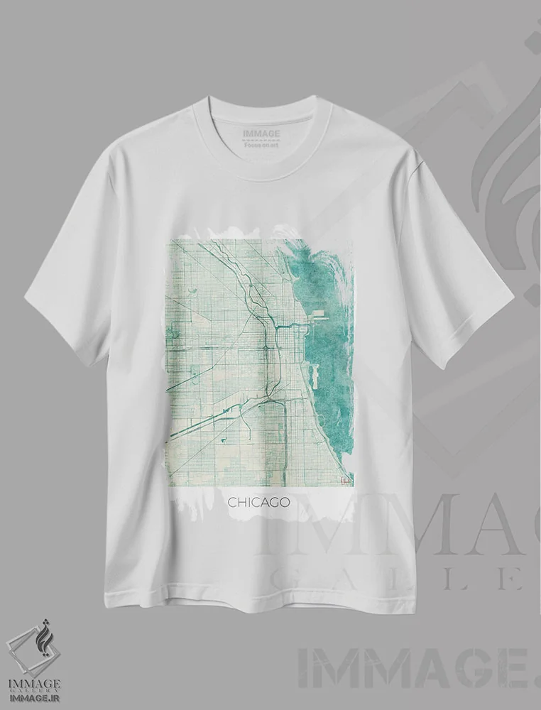 تیشرت سفید طرح دار نقشه طرح شهری آبرنگی آبی قدیمی شیکاگو، تزئینی اثر هوبرت روگوسکی | فروشگاه ایماژ تیشرت طرح دار نقشه طرح شهری آبرنگی آبی قدیمی شیکاگو اثر هوبرت روگوسکی