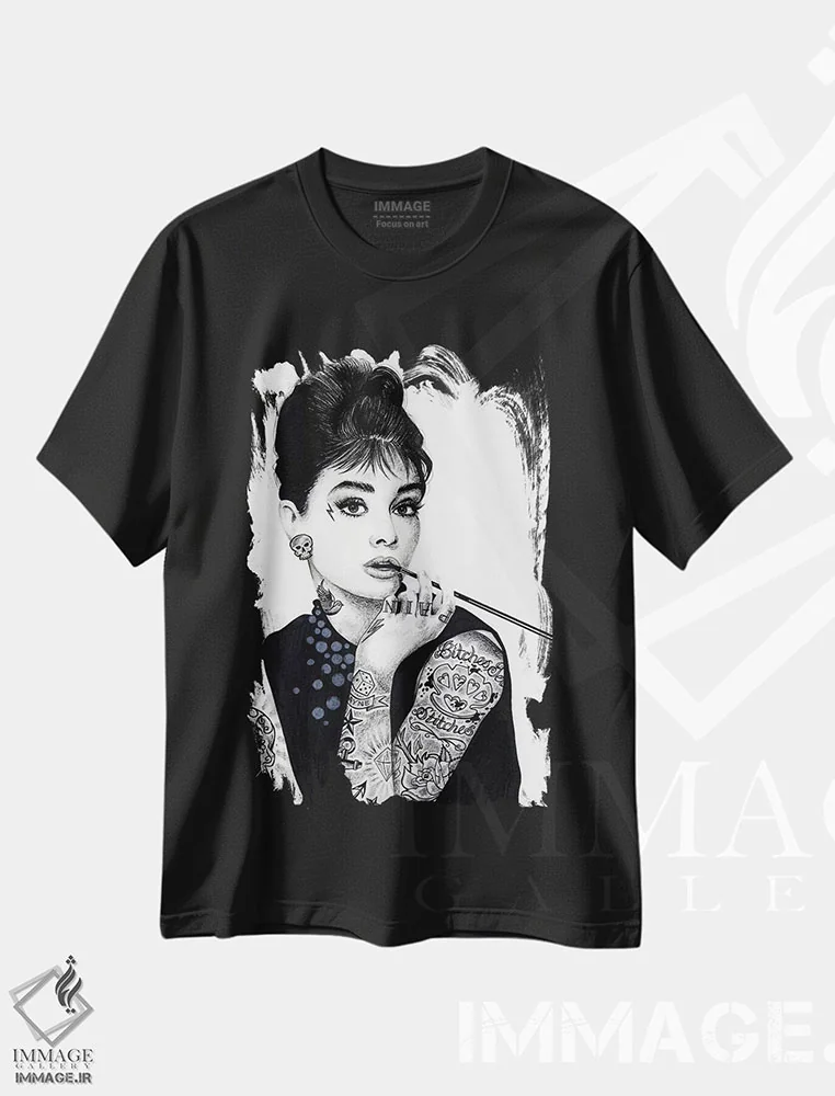 تیشرت مشکی طرح دار آدری هپبورن، هنر فاخر معاصر اثر اینکد آیکونز | فروشگاه ایماژ تیشرت طرح دار آدری هپبورن اثر اینکد آیکونز