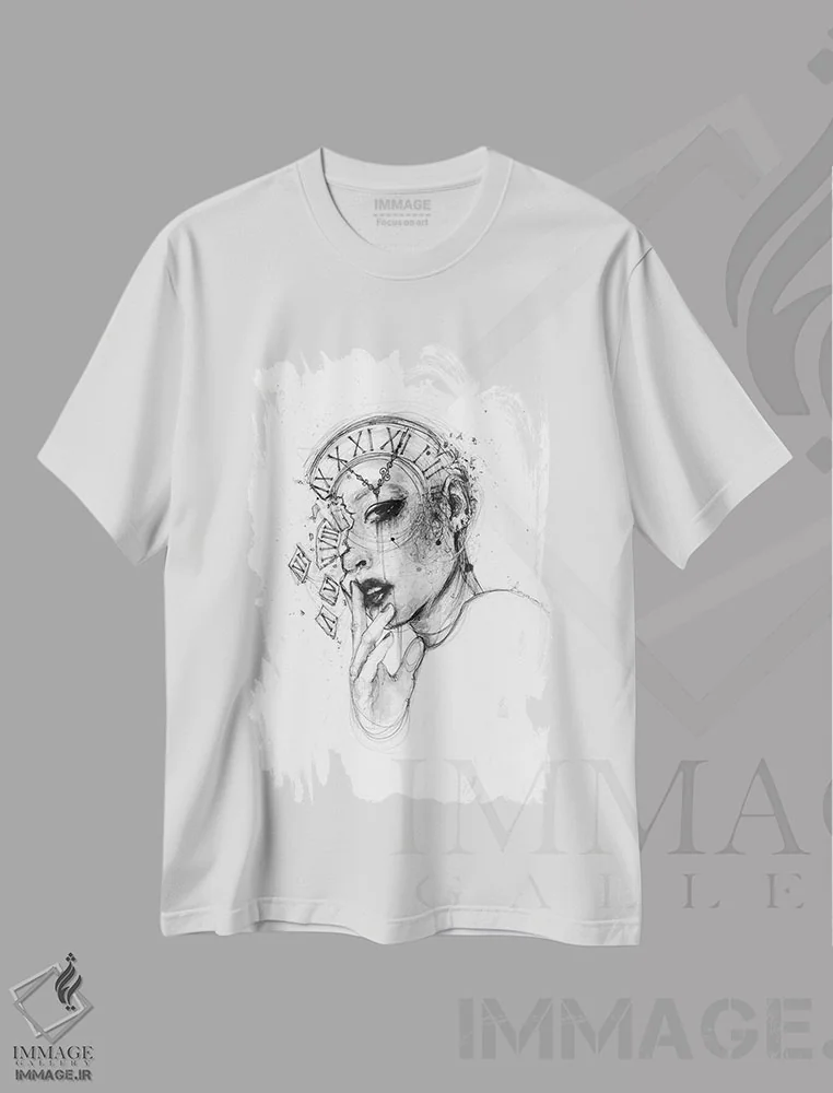 تیشرت سفید طرح دار ساعت، دکوراسیون جایگزین اثر دوریانا پوپا | فروشگاه ایماژ تیشرت طرح دار ساعت اثر دوریانا پوپا