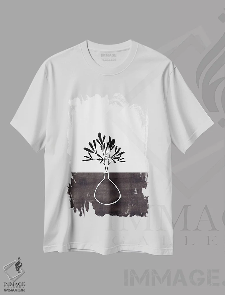 تیشرت سفید طرح دار گلدان جوهر مشکی، آبستره اثر ان شیپ | فروشگاه ایماژ تیشرت طرح دار گلدان جوهر مشکی اثر ان شیپ
