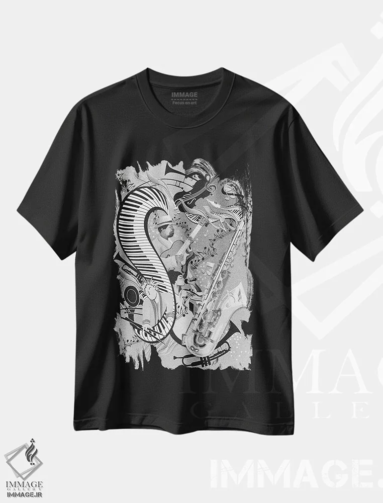 تیشرت مشکی طرح دار اجرای داغ جَز قرمز، هنر تزئینی سیاه و سفید اثر جولیز | فروشگاه ایماژ تیشرت طرح دار اجرای داغ جَز قرمز اثر جولیز
