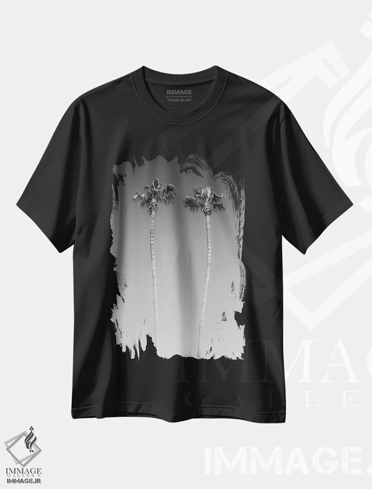 تیشرت مشکی طرح دار – تیشرت هنری سیاه و سفید ,درختان نخل اثر ملانی ویولا فروشگاه ایماژ تیشرت طرح هنری سیاه و سفید ,درختان نخل اثر ملانی ویولا