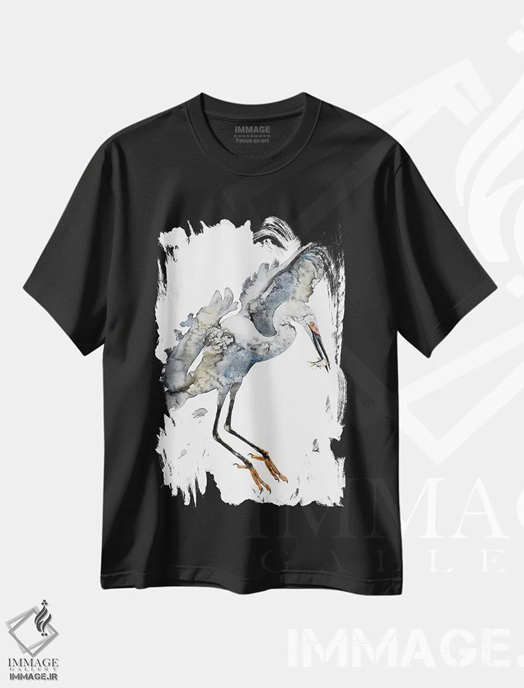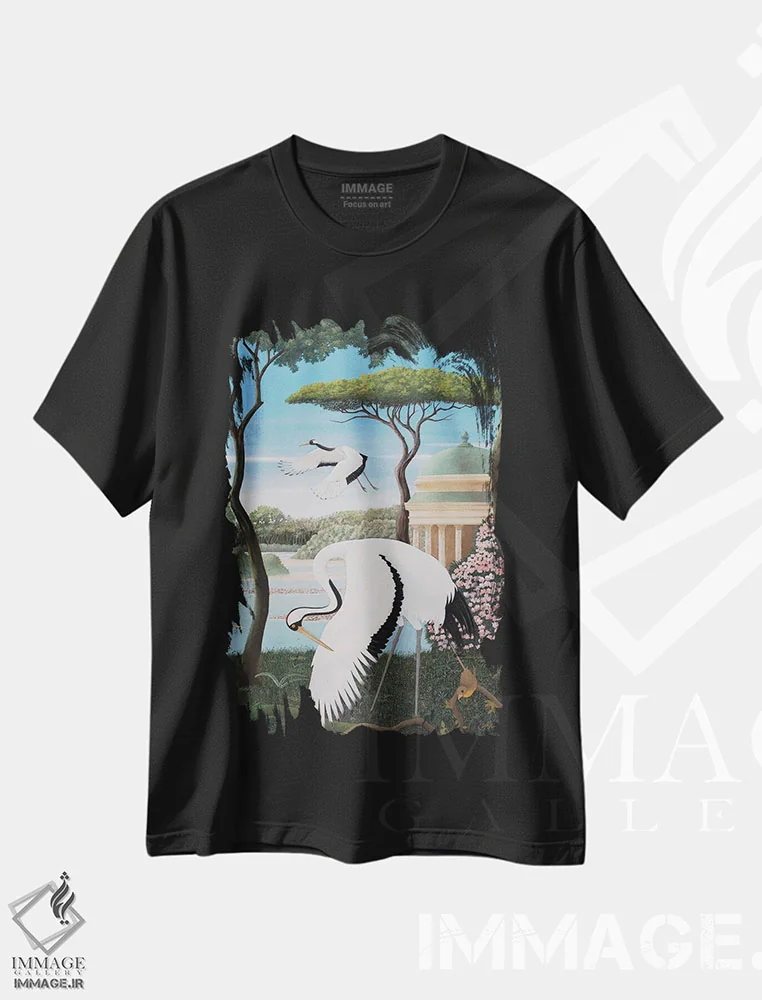تیشرت مشکی طرح دار هارمونی حواصیل ها، دکور آسیایی اثر سو بنگ لیم | فروشگاه ایماژ تیشرت طرح دار هارمونی حواصیل ها اثر سو بنگ لیم