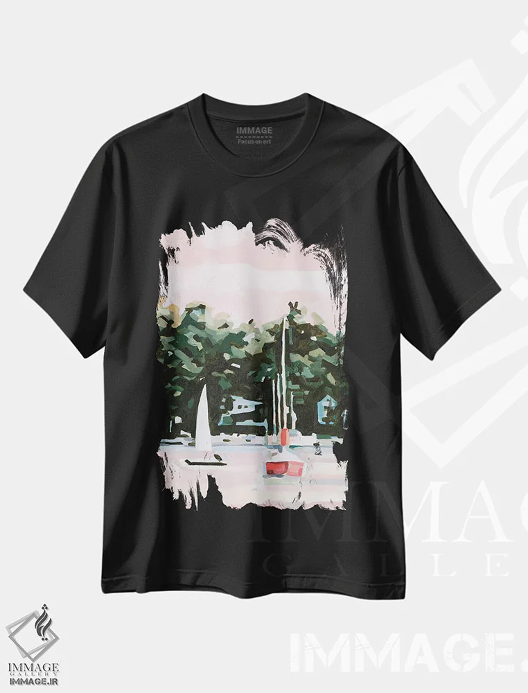 تیشرت مشکی طرح دار عصرگاه دریاچه ۲، تزئینی اثر اما اسکاروی | فروشگاه ایماژ تیشرت طرح دار عصرگاه دریاچه اثر اما اسکاروی