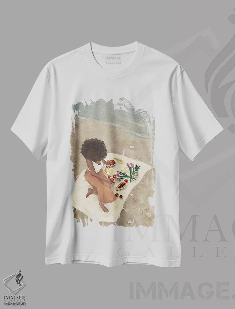 تیشرت سفید طرح دار پیک نیک ساحلی، هنر آمریکایی آفریقایی تبار اثر هلینا اکنم | فروشگاه ایماژ تیشرت طرح دار پیک نیک ساحلی اثر هلینا اکنم
