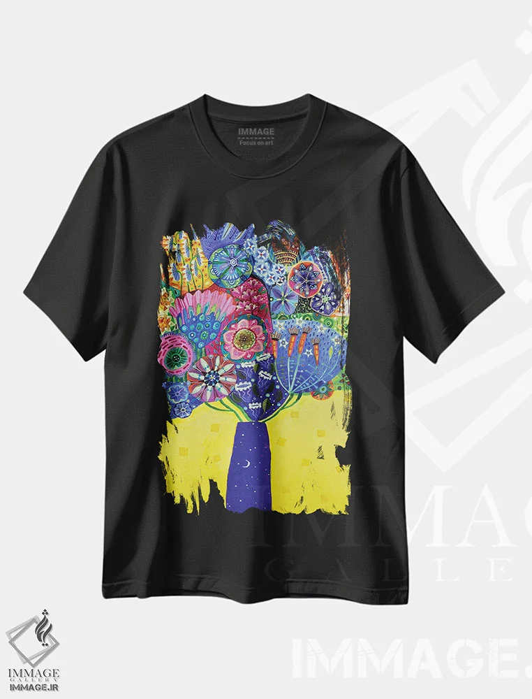تیشرت مشکی طرح دار – تیشرت تابستانی ,شکوفه های تابستانی اثر لینت شلی فروشگاه ایماژ تیشرت طرح تابستانی ,شکوفه های تابستانی اثر لینت شلی