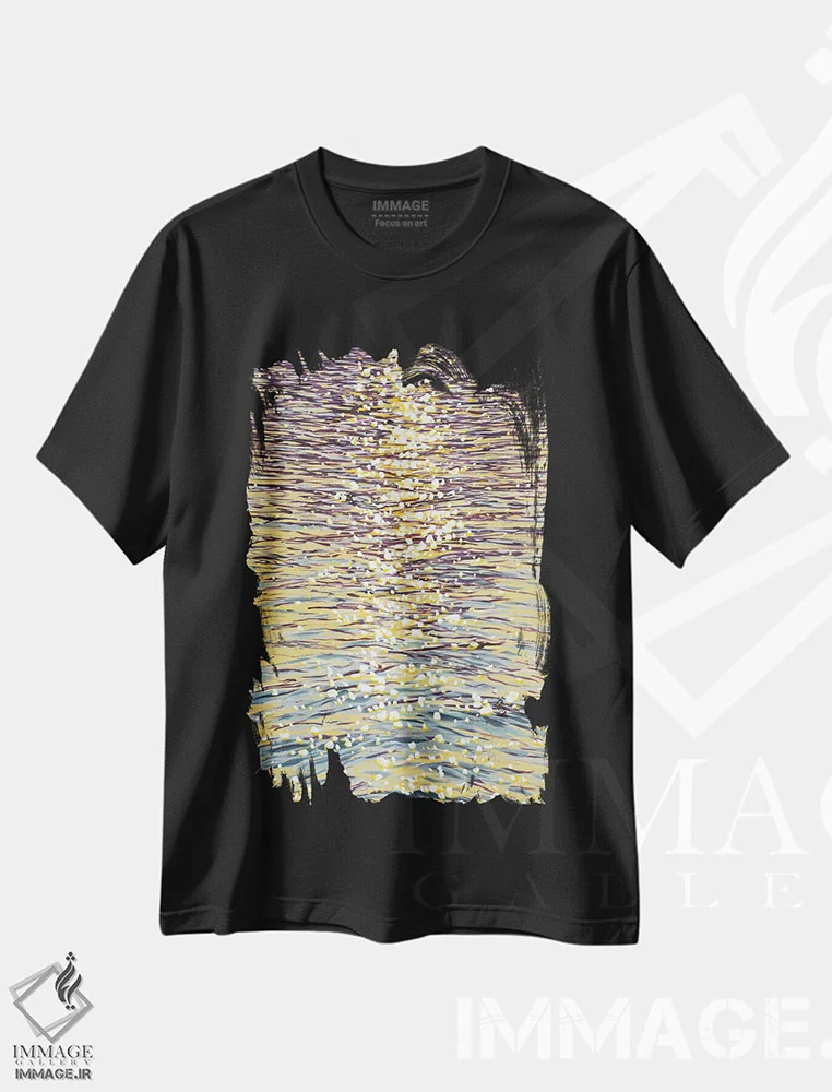 تیشرت مشکی طرح دار درخشش غروب روی آب VII، دکور ساحلی اثر ایرینا کاستسووا | فروشگاه ایماژ تیشرت طرح دار درخشش غروب روی آب VII اثر ایرینا کاستسووا