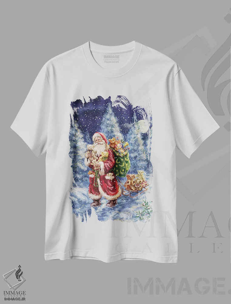 تیشرت سفید طرح دار – تیشرت کریسمس ,بابانوئل در جنگل زمستانی با کیسه اثر مارچلو کورتی فروشگاه ایماژ تیشرت طرح کریسمس ,بابانوئل در جنگل زمستانی با کیسه اثر مارچلو کورتی