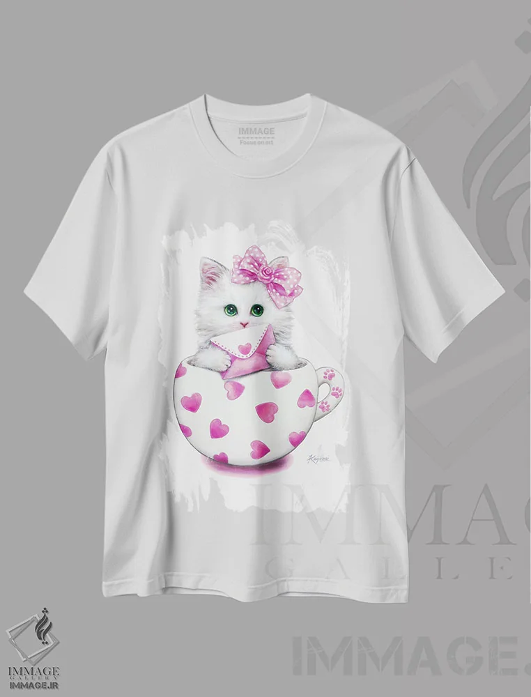 تیشرت سفید طرح دار گربه فنجانی قلبی، تزئینی اثر کایومی هارای | فروشگاه ایماژ تیشرت طرح دار گربه فنجانی قلبی اثر کایومی هارای