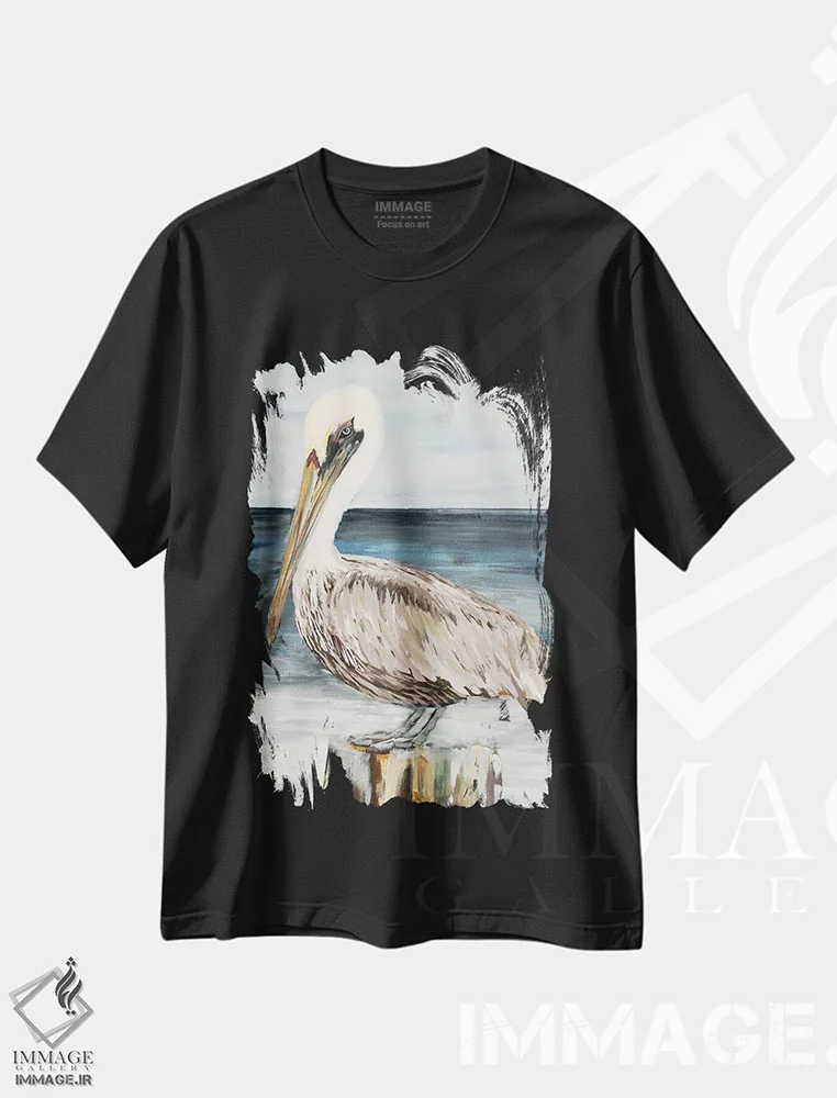 تیشرت مشکی طرح دار پلیکان نشسته با رنگ ملایم، دکور ساحلی اثر جولی دریسه | فروشگاه ایماژ تیشرت طرح دار پلیکان نشسته با رنگ ملایم اثر جولی دریسه