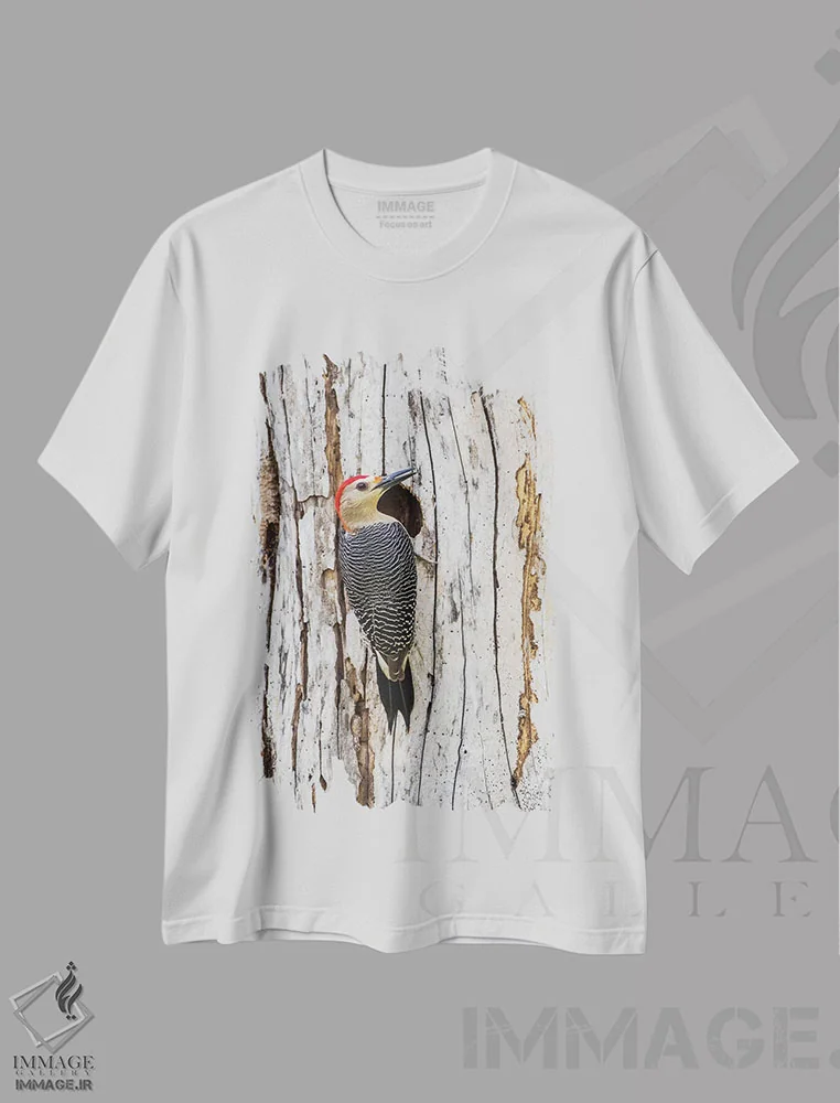تیشرت سفید طرح دار آثار الیزابت بوم - immage.ir تیشرت طرح دار بلیز، پناهگاه حیات وحش کروکد تری، دارکوب طلایی پیشانی نشسته بر لانه اثر الیزابت بوم