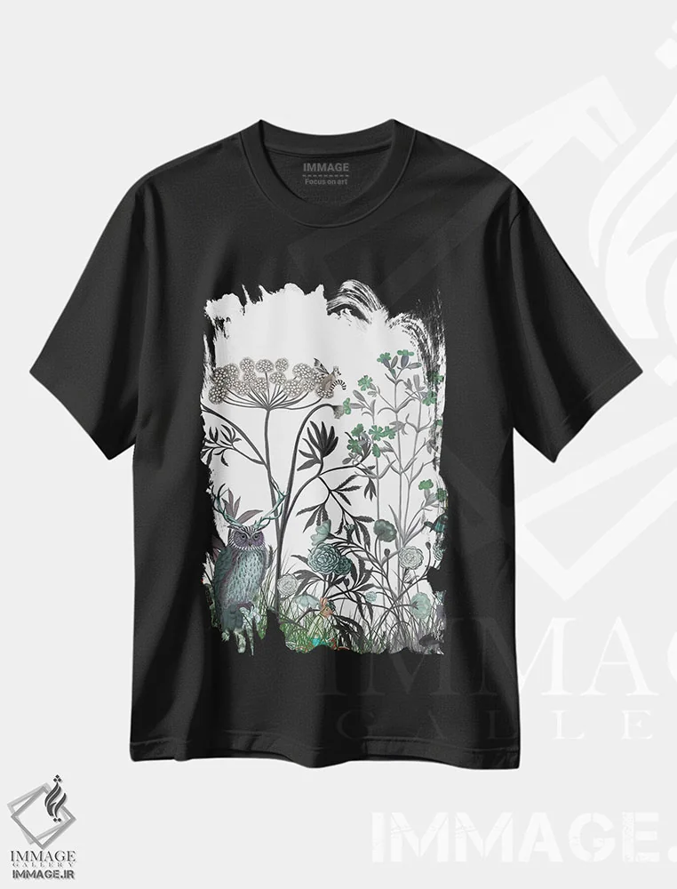 تیشرت مشکی طرح دار شکوفه گل های وحشی با جغد، هنر دیجیتال اثر فب فانکی | فروشگاه ایماژ تیشرت طرح دار شکوفه گل های وحشی با جغد اثر فب فانکی