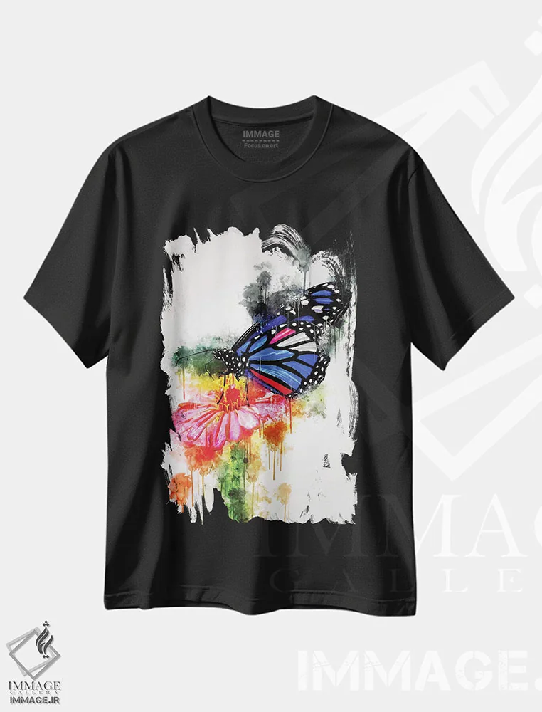 تیشرت مشکی طرح دار پروانه های شاداب، تزئینی اثر ادسون راموس | فروشگاه ایماژ تیشرت طرح دار پروانه های شاداب اثر ادسون راموس