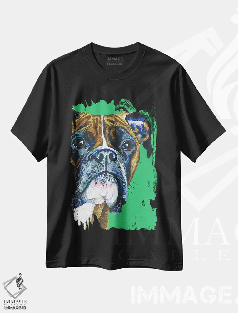 تیشرت مشکی طرح دار باکسر روی زمینه زمردی، مدیوم اثر کیرستین وود | فروشگاه ایماژ تیشرت طرح دار باکسر روی زمینه زمردی اثر کیرستین وود