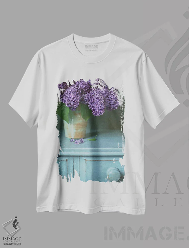 تیشرت سفید طرح دار طبیعت بی جان یاس بنفش، مدیوم اثر آلیسون فنل | فروشگاه ایماژ تیشرت طرح دار طبیعت بی جان یاس بنفش اثر آلیسون فنل