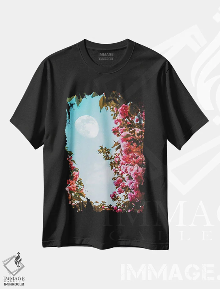 تیشرت مشکی طرح دار ماه و گل های صورتی زیباشناسانه، هنر دیجیتال اثر جن زد | فروشگاه ایماژ تیشرت طرح دار ماه و گل های صورتی زیباشناسانه اثر جن زد