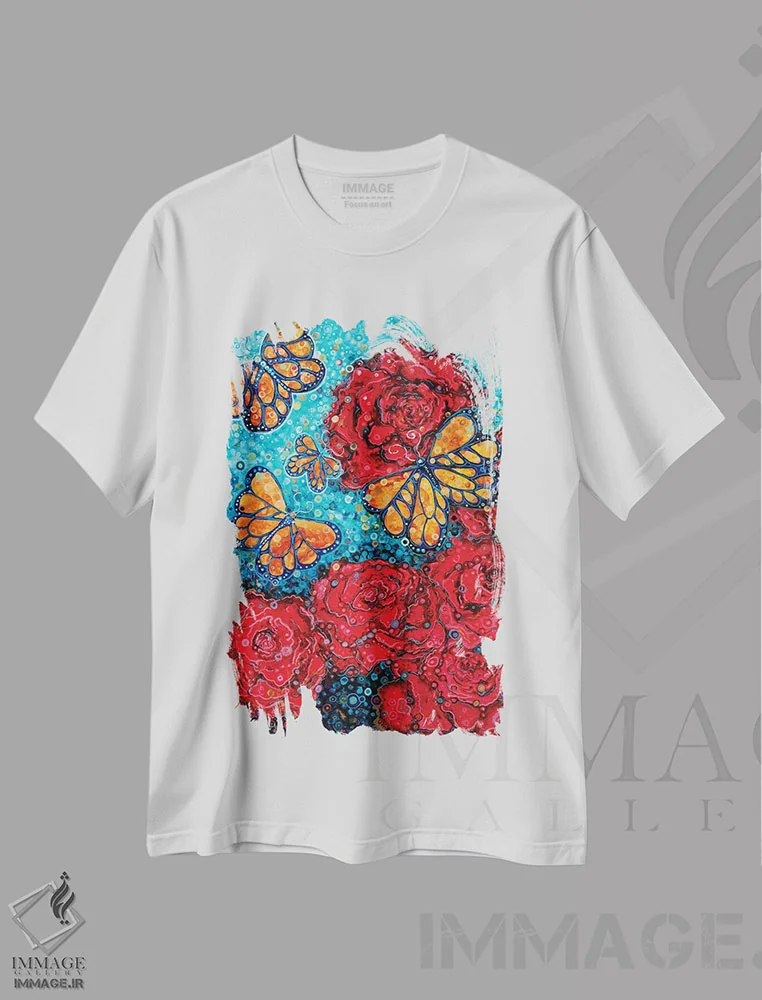 تیشرت سفید طرح دار گل سرخ و پروانه ها، هنر فاخر معاصر اثر هایدی بارنت | فروشگاه ایماژ تیشرت طرح دار گل سرخ و پروانه ها اثر هایدی بارنت