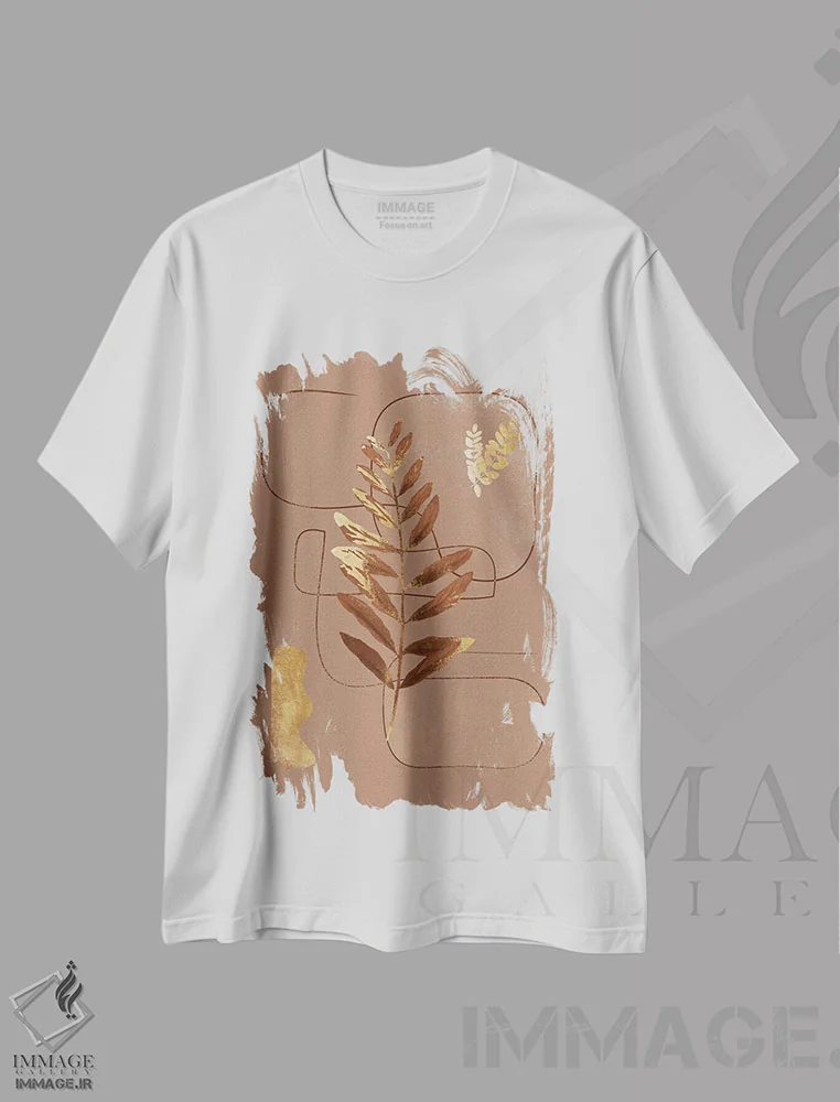 تیشرت سفید طرح دار برگ طلایی انتزاعی III، آبستره اثر هلو مورائس | فروشگاه ایماژ تیشرت طرح دار برگ طلایی انتزاعی III اثر هلو مورائس