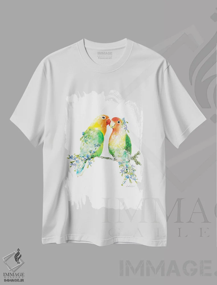 تیشرت سفید طرح دار مرغ عشق گیاهی حیات وحش، هنر دیجیتال اثر لولا دیزاین | فروشگاه ایماژ تیشرت طرح دار مرغ عشق گیاهی حیات وحش اثر لولا دیزاین