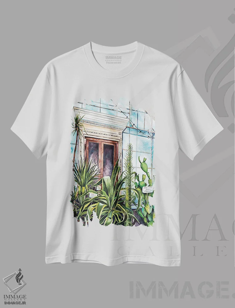 تیشرت سفید طرح دار – تیشرت گیاهی ,باغ کاکتوس اثر کریستین لیندستروم فروشگاه ایماژ تیشرت طرح گیاهی ,باغ کاکتوس اثر کریستین لیندستروم