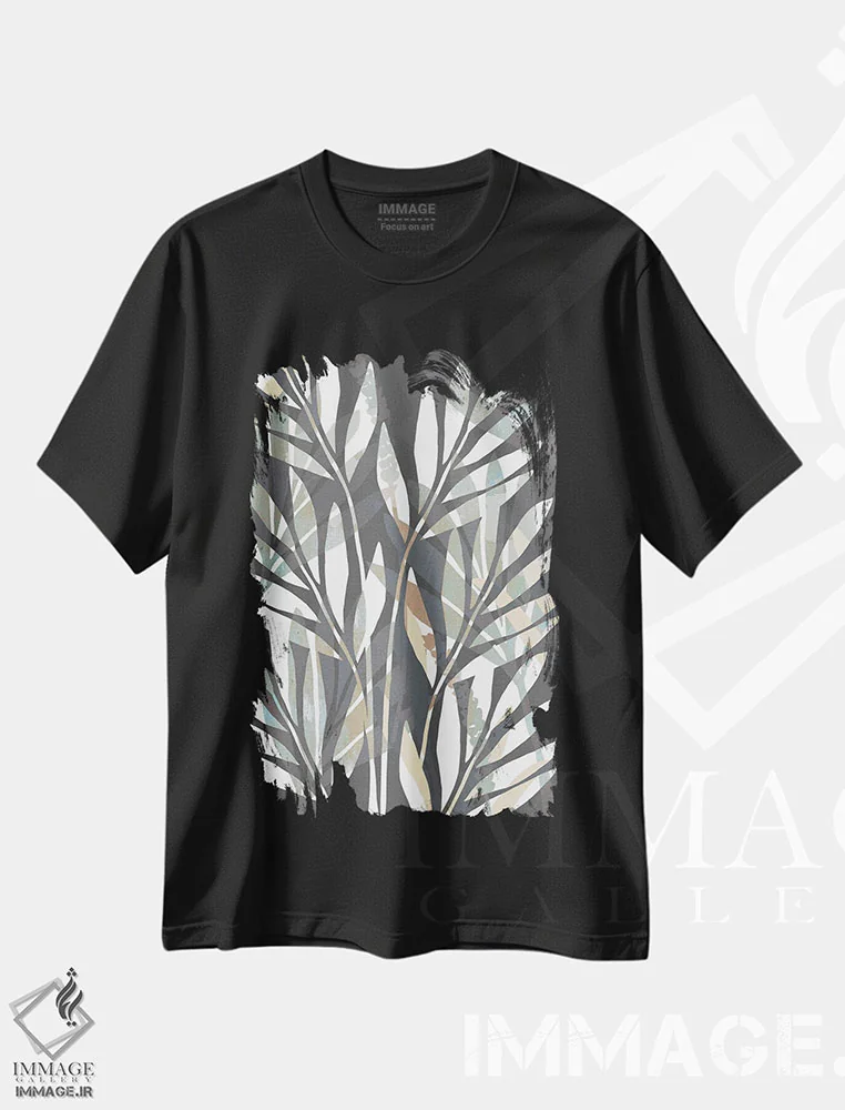 تیشرت مشکی طرح دار برگ ها، آبستره اثر چایا شرادر | فروشگاه ایماژ تیشرت طرح دار برگ ها اثر چایا شرادر