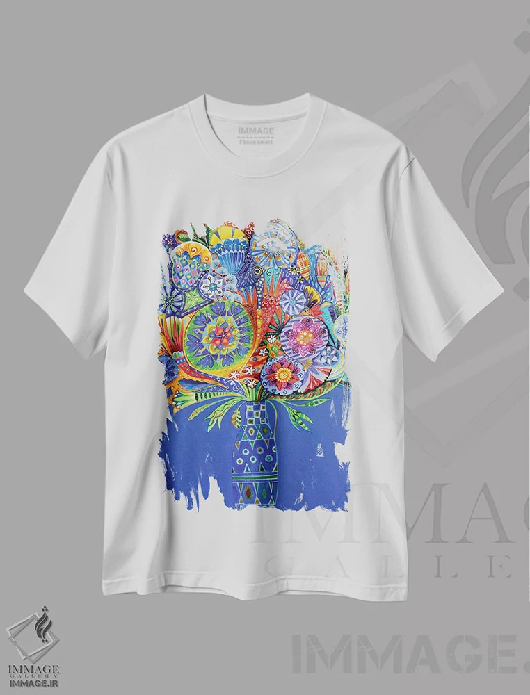 تیشرت سفید طرح دار بازار گل ۲، تزئینی اثر فلورا کوتا | فروشگاه ایماژ تیشرت طرح دار بازار گل اثر فلورا کوتا