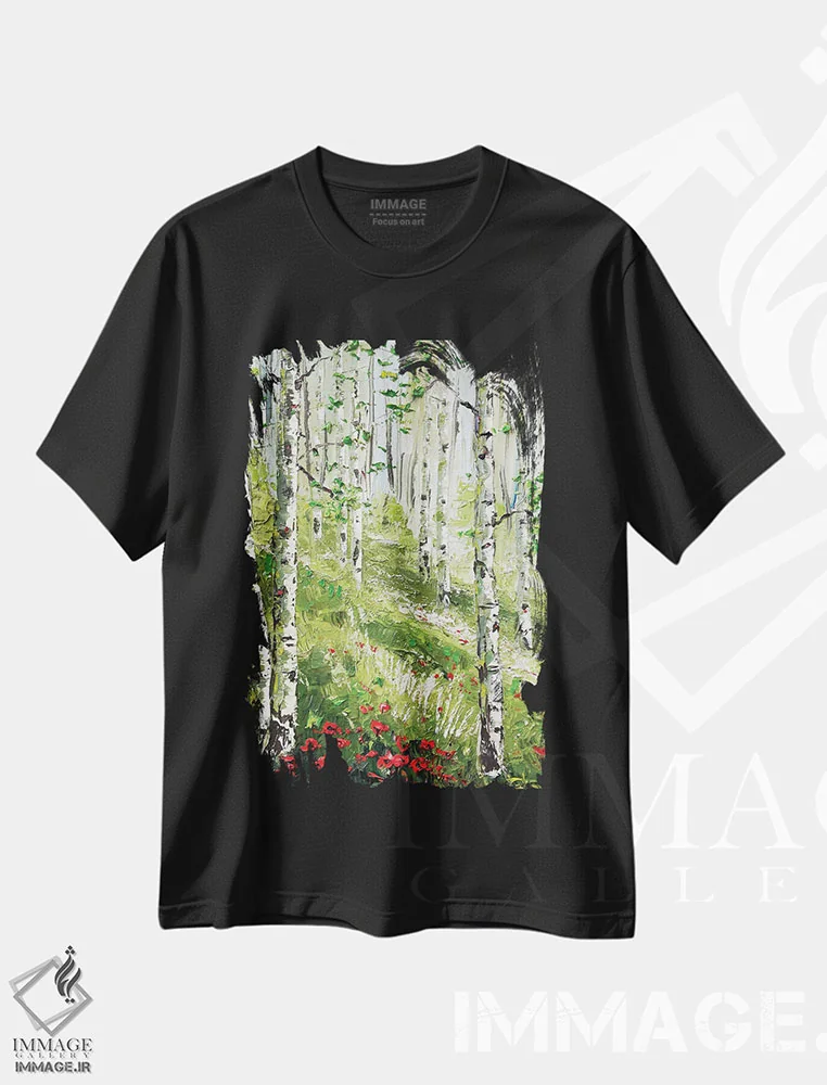 تیشرت مشکی طرح دار رویای جنگلی تابستان، دکور معاصر اثر لیزا الی | فروشگاه ایماژ تیشرت طرح دار رویای جنگلی تابستان اثر لیزا الی